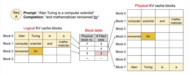 - PagedAttention: This unique feature allows vLLM to manage memory efficiently by dividing KV caches into blocks stored in non-contiguous memory spaces. This method minimizes memory waste and allows larger batch sizes.