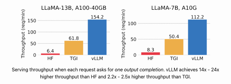vLLM uses continuous batching, a strategy that dynamically groups incoming requests for efficient processing. This approach significantly boosts throughput compared to other serving frameworks like Hugging Face Transformers and TensorRT-LLM. Benchmark tests have shown that vLLM can achieve up to 24 times the throughput of some existing solutions.